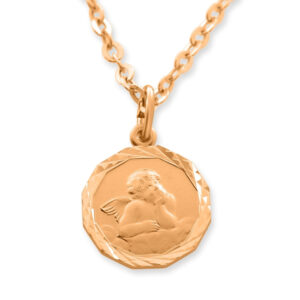 Der runde Anhänger hat einen glänzend polierten Rand. In der Mitte des Kettenanhängers befindet sich das beliebte (Schutz) Engelchen Rafael auf einer Wolke (edel mattiert). Der Anhänger ist ca. 1,5×1,2cm groß. Alle Metallelemente sind aus 925 Sterling Silber und werden in Juwelierqualität hochwertig rosé vergoldet.